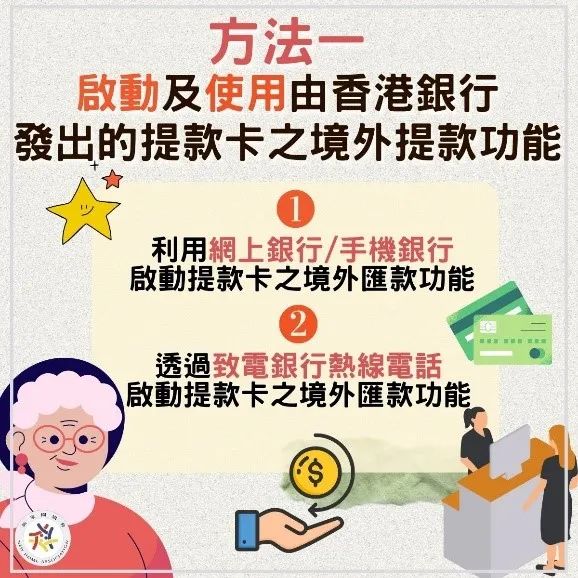 现时香港政府发放的社会保障款项会直接转帐至受惠人指定的香港银行帐户。惟部分受惠人因各种原因无法如期回到香港,提取计划下所批出的津贴款项。有见及此,本协会整合出以下4个方法,即使《广东计划》及《综援长者广东省养老计划》受惠人不能回港,亦能将香港银行户口所获得的相关津贴,汇款至其内地银行的帐户,以便提取使用: